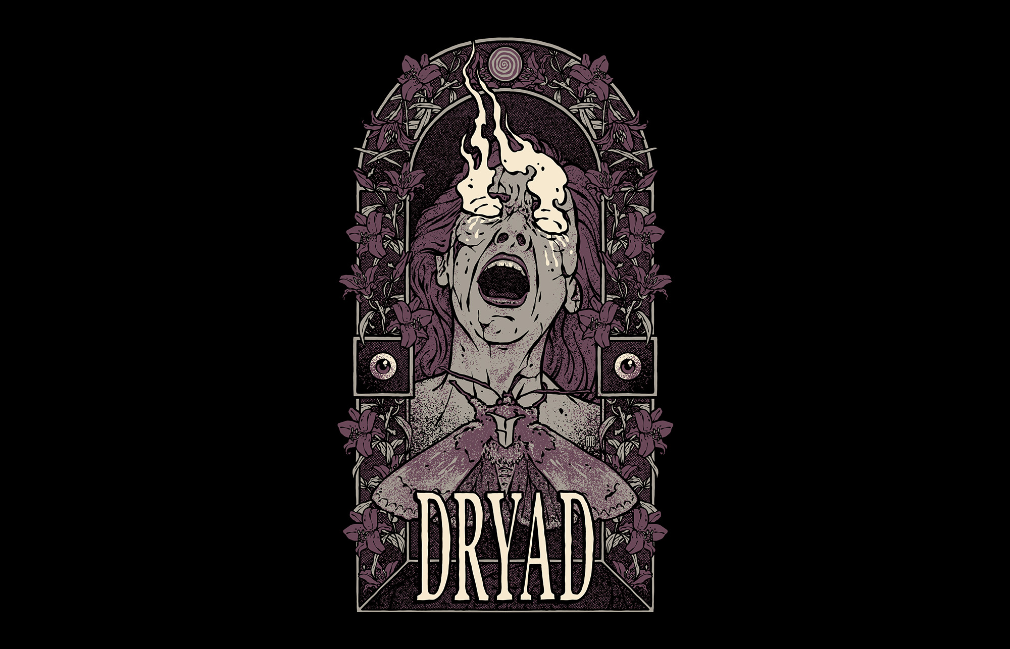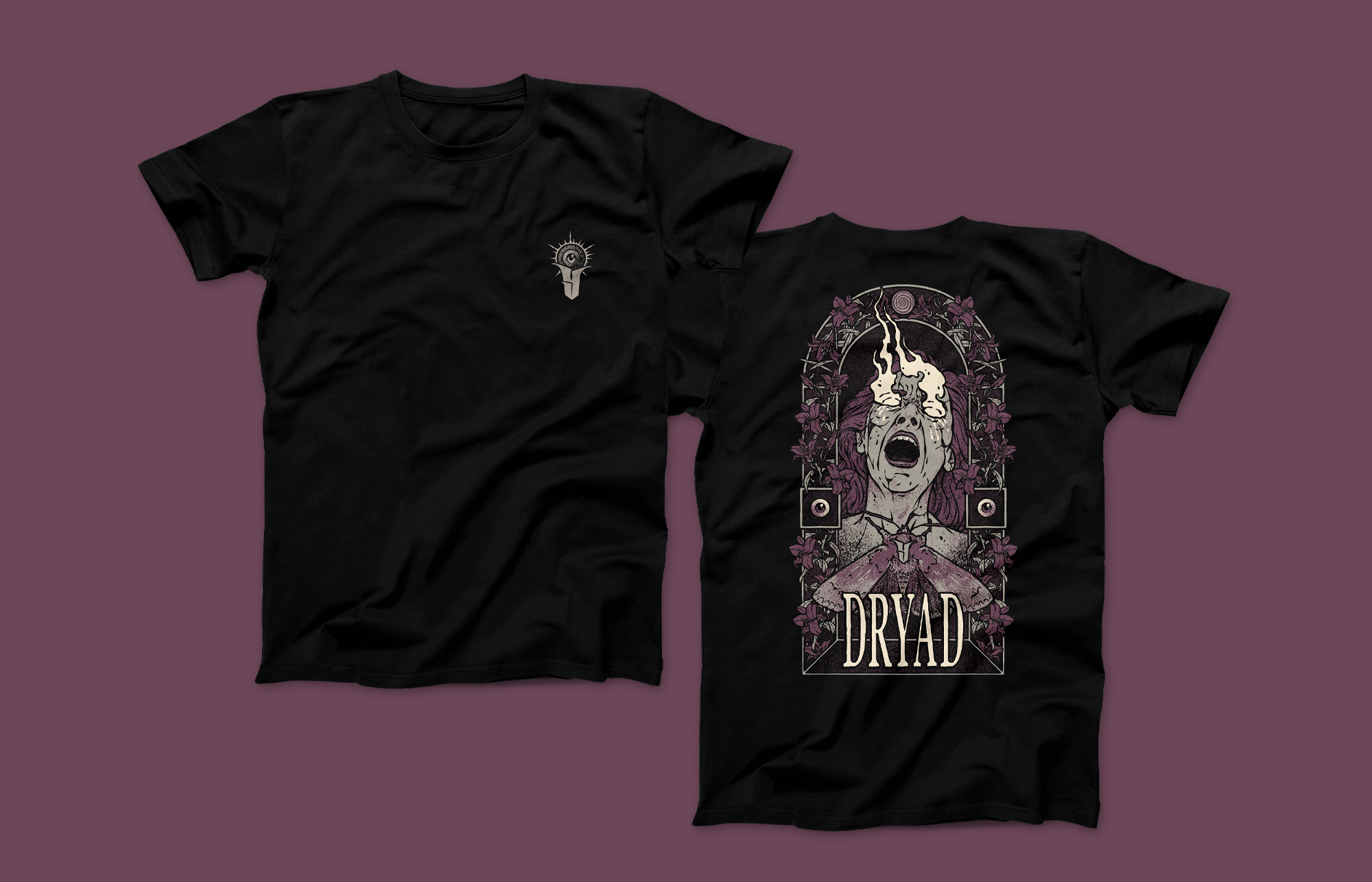Düstere Illustration im ATE-Stil. Für die Würzburger Band Dryad haben wir dieses T-Shirt Motiv illustriert. Perfekt passend zu deren Heavy Stoner Rock Musik.