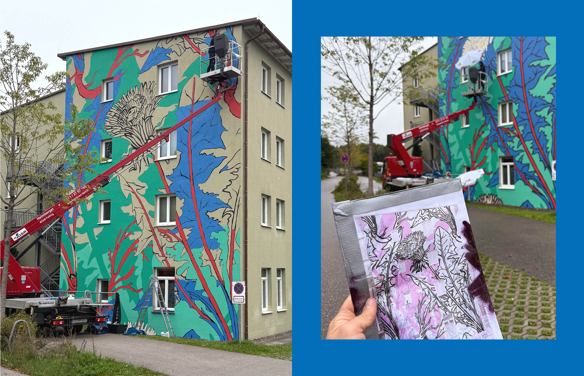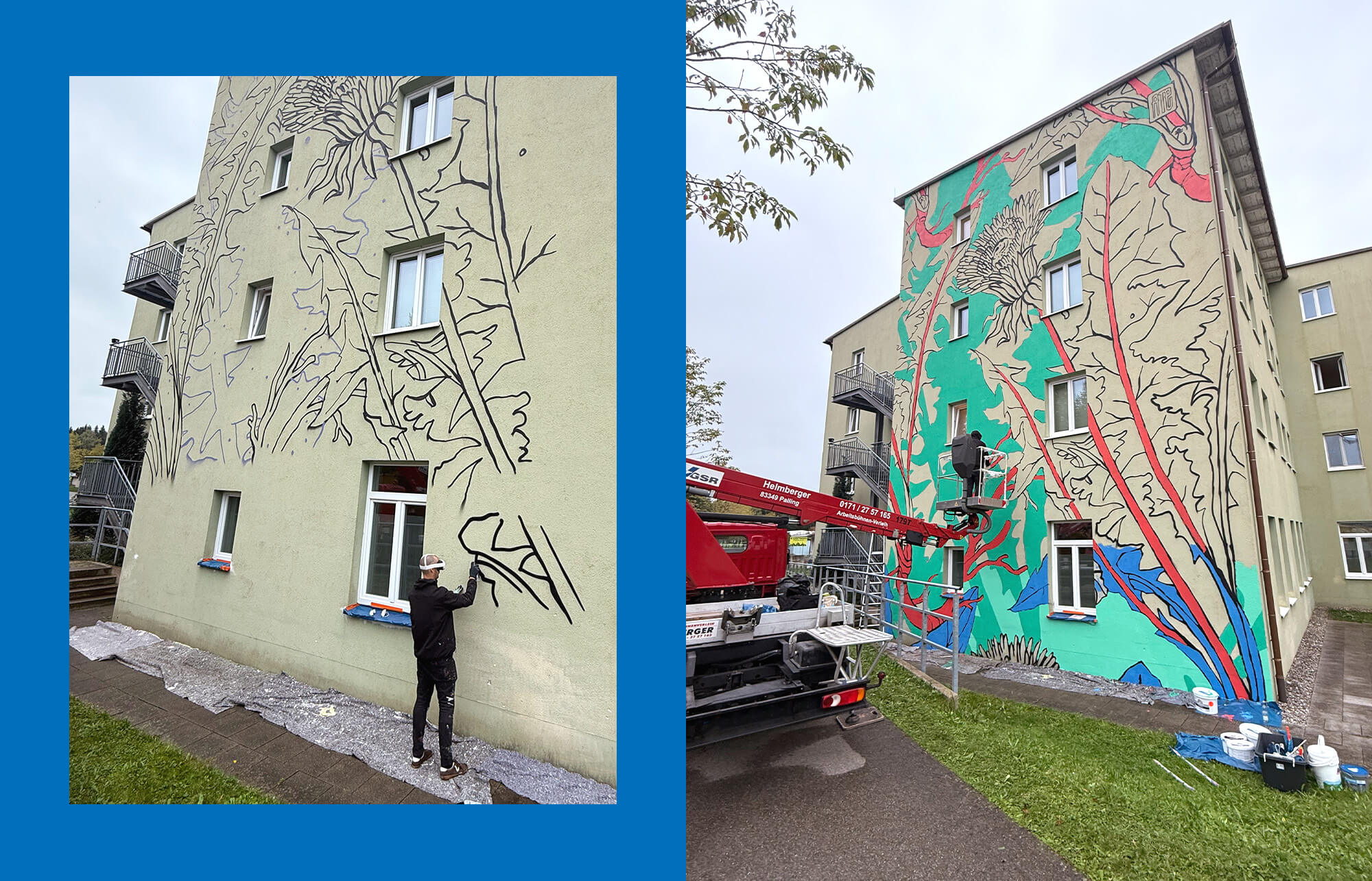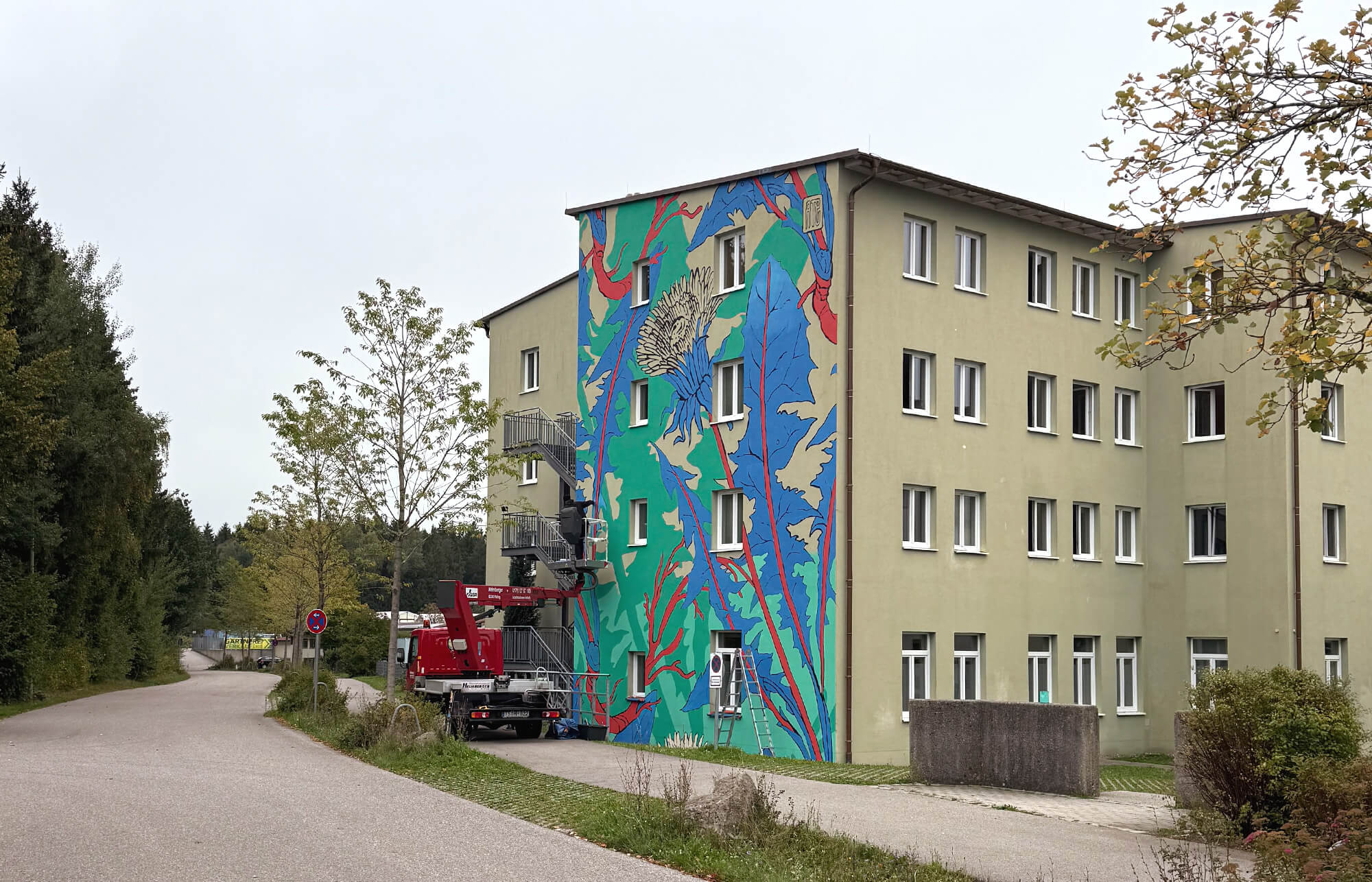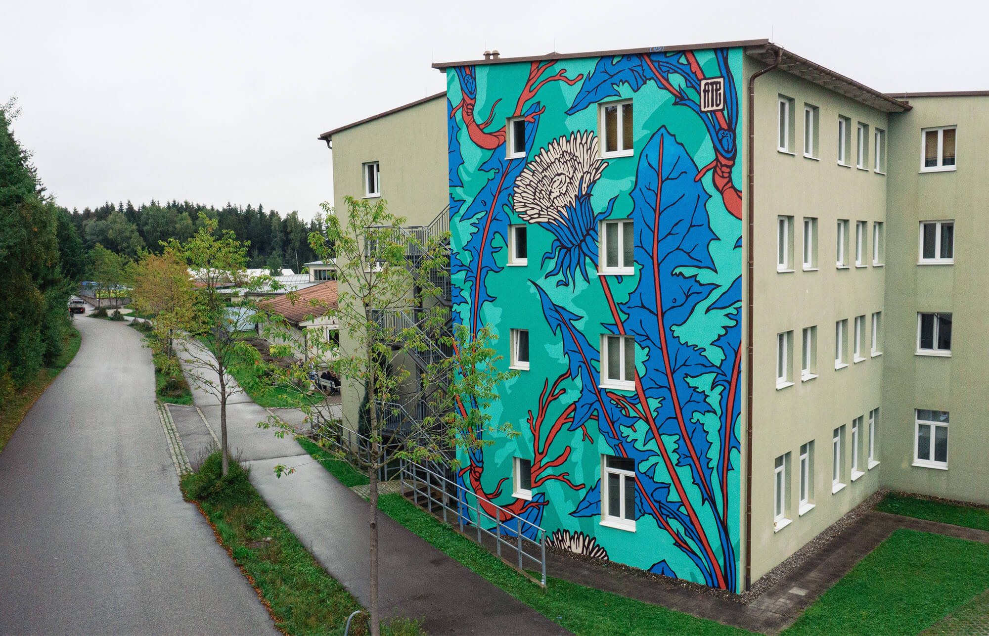Im Rahmen der Chiemgauer Kulturtage entstand in Zusammenarbeit mit dem Landratsamt Traunstein und der Jugendsiedlung Traunreut ein vierstöckiges Wandbild (Mural) an der Fassade des Wohnheims der Jugendsiedlung in Traunreut.