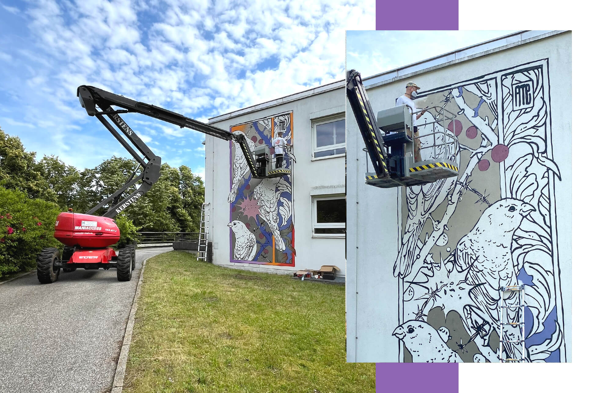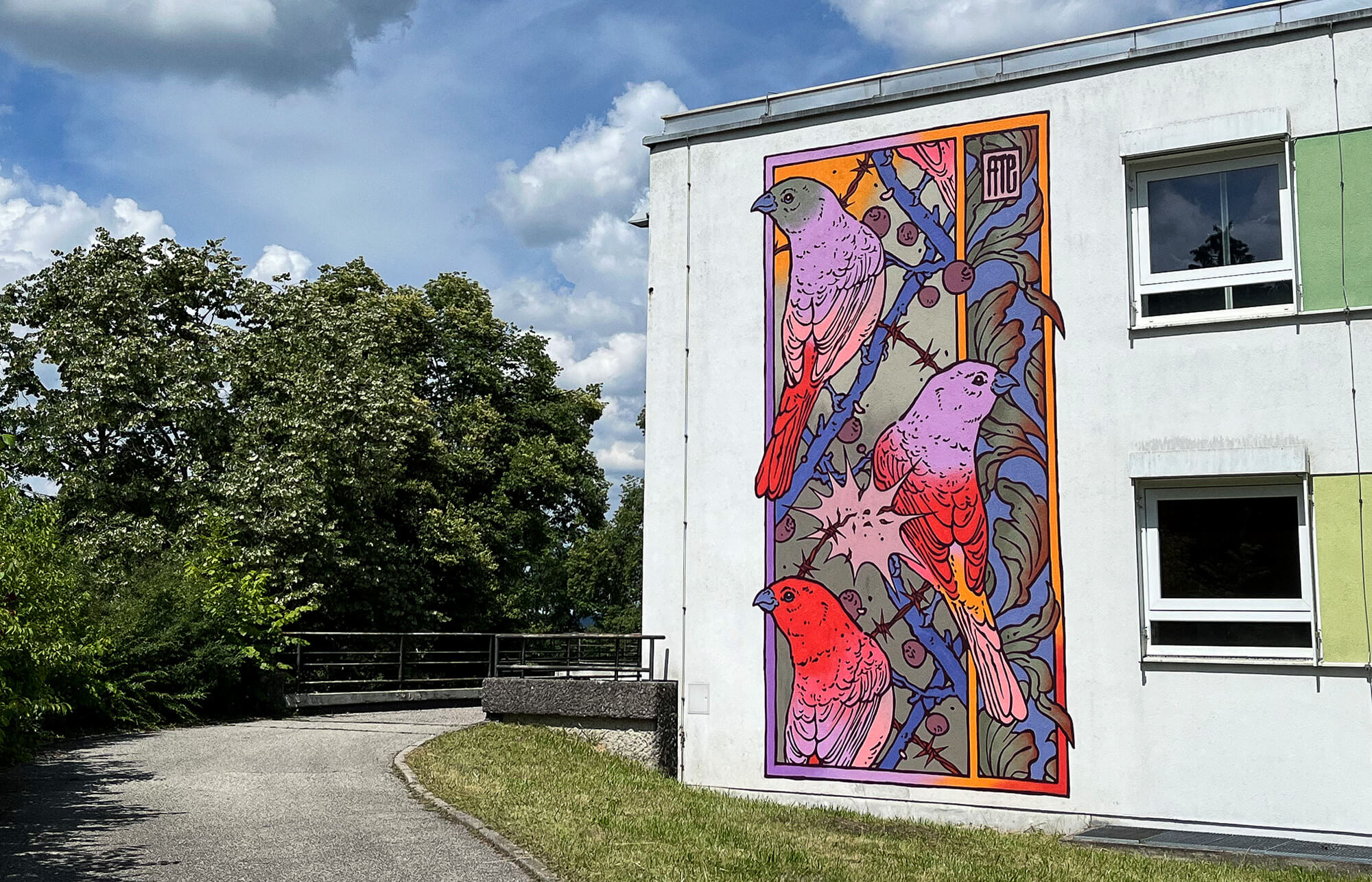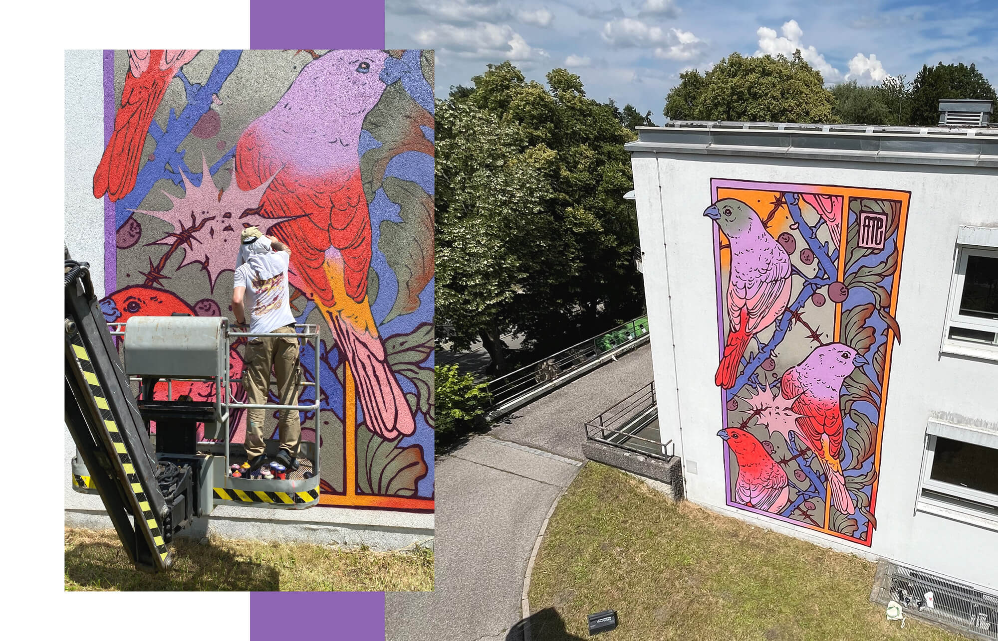 Im Rahmen der Chiemgauer Kulturtage entstand in Zusammenarbeit mit dem Landratsamt Traunstein und der Jugendsiedlung Traunreut ein vierstöckiges Wandbild (Mural) an der Fassade des Wohnheims der Jugendsiedlung in Traunreut.